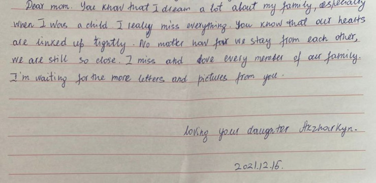 "Дорогая мама. Вы знаете, как я много мечтаю о своей семье: особенно когда я была ребенком, я очень скучала по всем. Вы знаете, что наши сердца тесно связаны. Мы все еще так близки. Я скучаю и люблю каждого члена нашей семьи. Я жду от вас больше писем и фотографий. С любовью, ваша дочь Акжаркын", - говорится в тексте письма, датированного 15 декабря прошлого года. Отметим, что текст был написан на английском языке по требованию администрации тюрьмы, чтобы она понимала смысл написанных заключенной слов.