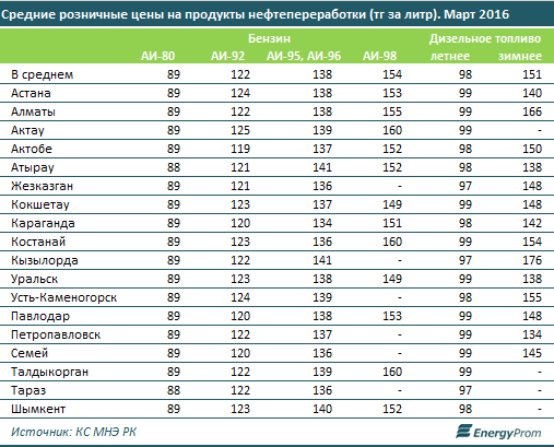 С начала 2016 года цены на бензин марки АИ-92 снизились на 1,8 процента, до 122 тенге за литр, сообщает аналитическая служба Energyprom.kz. Стоимость летнего дизеля, наоборот, выросла на 1,2 процента, до 98 тенге за литр.