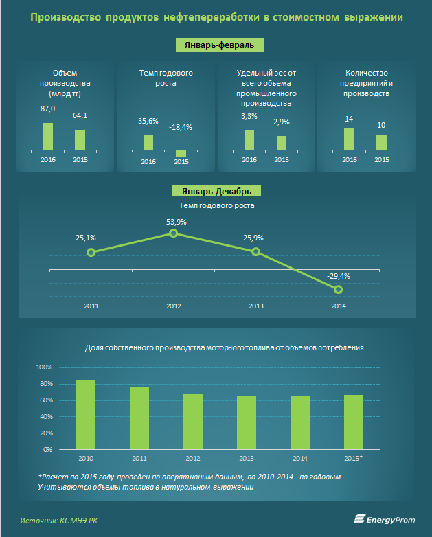 Тем временем, производство бензина за январь-февраль 2016 года увеличилось к аналогичному периоду прошлого года на 4,8 процента, до 448 тысяч тонн, дизельного топлива - напротив, снизилось на 28,1 процента, до 546 тысяч тонн. Производство продуктов нефтепереработки в стоимостном выражении выросло более чем на треть, до 87 миллиардов тенге. Эксперты отметили, что собственное производство по-прежнему обеспечивает всего две трети внутренней потребности страны в моторном топливе. Для сравнения, в 2015 году было 67,1 процента, в январе 2016 года - 71,7 процента.