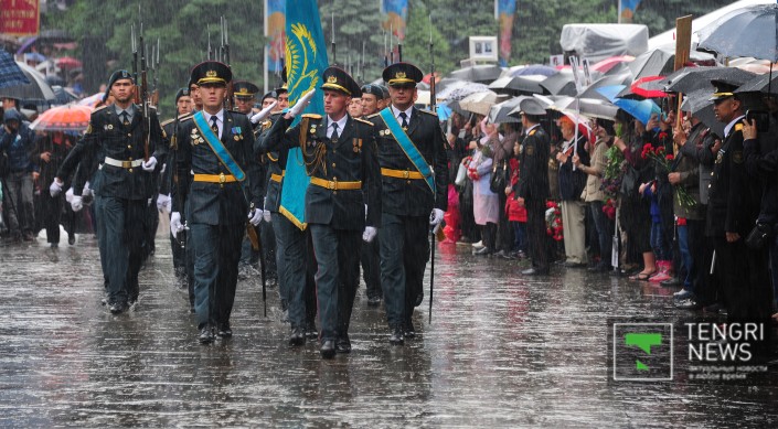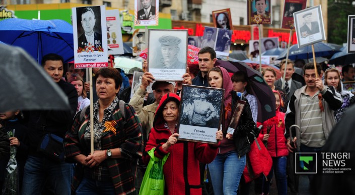 Также стоит отметить, что в Алматы, несмотря на дождь, состоялось крупнейшее казахстанское шествие "Бессмертного полка", в котором приняли участие, по оценке организаторов, более 20 тысяч человек. Жители города с портретами ветеранов Великой Отечественной войны и зонтами прошли от площади "Астана" до парка имени 28 гвардейцев-панфиловцев.