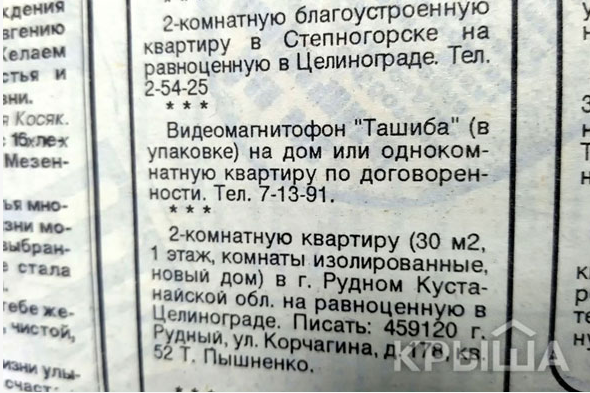 "Объявлений о продаже квартир в газете практически нет, оно и понятно - приватизация только началась. Зато полно предложений обмена, в которых квартиру в провинциальном городе Казахстана предлагают сменить на аналогичное жилище в окрестных ПГТ (поселок городского типа) или других городах бывшего СССР. Например, "1-комнатную в Целинограде на 1-2-комнатную в Челябинске". Или "4-комнатную в Аркалыке на равноценную или 3-комнатную в Целинограде". Да, Аркалык тогда был еще областным центром. Или "2-комнатную в Грозном на 3-комнатную в Целинограде". Или "1-комнатную на ВАЗ-2106-09".