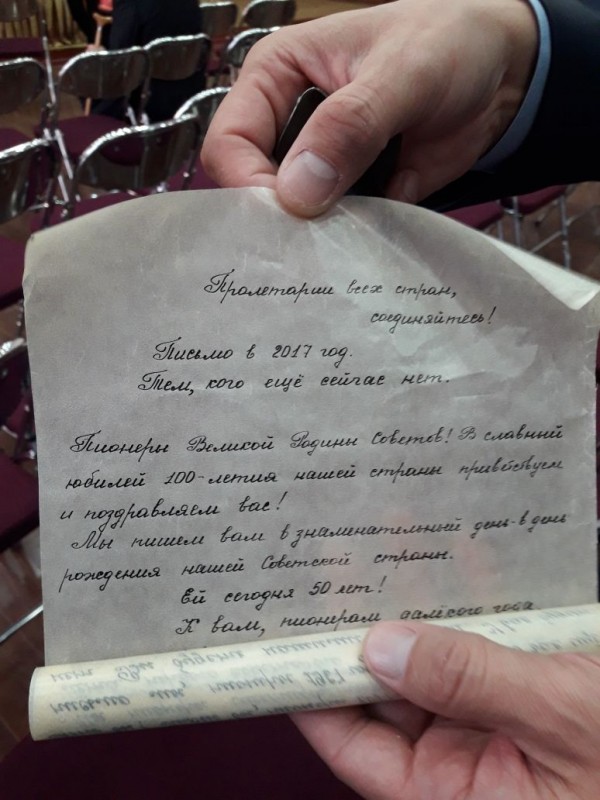 "Пролетарии всех стран, соединяйтесь! Письмо в 2017 год - тем, кого еще сейчас нет. Пионеры великой родины Советов, славный юбилей столетия нашей страны, приветствуем и поздравляем вас! Ну, пионеры, откликайтесь!
