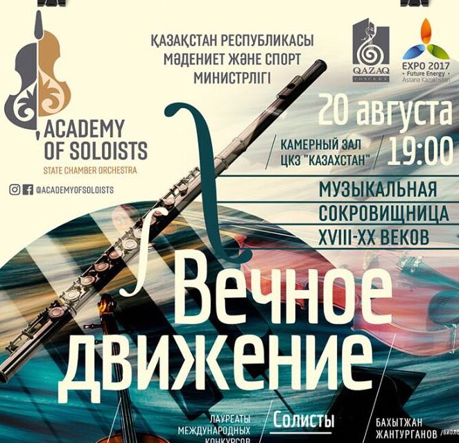 В камерном зале ЦКЗ "Казахстан" академия солистов представит концертный вечер "Вечное движение" из цикла "Энергия музыки". Прозвучат знаменитые камерные произведения, начиная с эпохи барокко и заканчивая композициями современных классиков - Вивальди, Баха, Сен-Санса, Боттезини и других. Музыканты покажут эволюцию и непрерывное развитие музыкального исполнительства на фоне прошедших столетий и в современной трактовке признанных мастеров исполнительского искусства Казахстана.