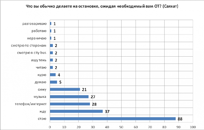 Исследователи установили, что 60 процентов пассажиров ожидали транспорт от 1 до 5 минут,  остальные 40  процентов - от 5 до 15 минут. После 7-10 минут ожидания некоторые люди ловят такси. На "Саяхате" за 40 минут такси ловят 59 человек, из них 46 - на второй полосе движения.
