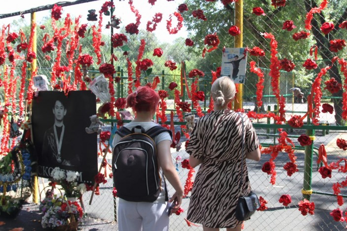 Алматинцы несут цветы к памятнику Денису Тену