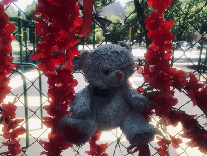 Мамы и бабушки дают детям в руки цветы, чтобы те сами возложили их к небольшому импровизированному алтарю с черно-белой фотографией Дениса.