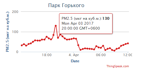 Самый новый в семействе пылевых датчиков алматинца прибор в районе Центрального парка отдыха в 20.00 3 апреля показывал, что в воздухе находится 130 мкг вредных частиц, а в 7.00 4 апреля качество воздуха отвечало всем международным нормам - 9 мкг. По состоянию на 12.30 значения пыли вновь превысили допустимый уровень и составили 42 мкг.