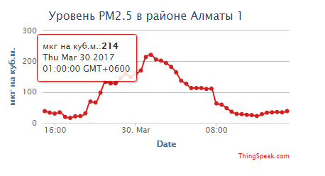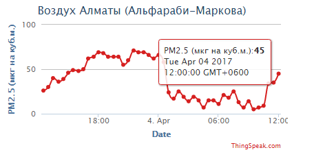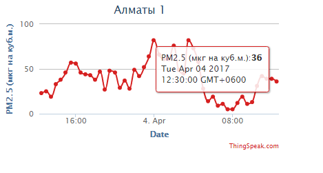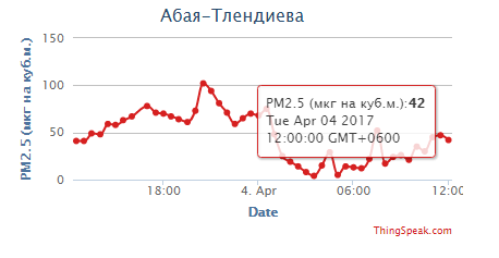 Датчик на Аль-Фараби и Маркова в 0.00 4 апреля показывал 66 мкг на кубический метр, а на Абая и Тлендиева в 0.30 было - 75 мкг. В 12.30 4 апреля датчики в этих точках показывают 45 и 42 мкг соответственно.