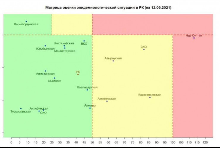 В "зеленой" зоне - все остальные регионы: Алматы, Шымкент, Актюбинская, Алматинская, Восточно-Казахстанская, Жамбылская, Кызылординская, Мангистауская, Павлодарская, Северо-Казахстанская и Туркестанская области.