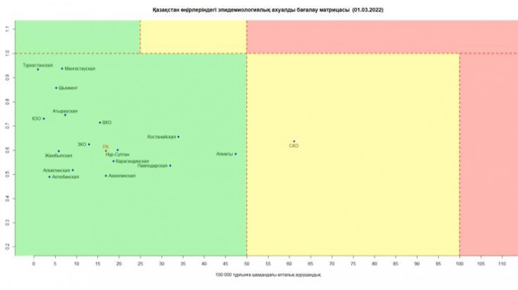Согласно матрице оценки эпидемиологической ситуации в регионах Казахстана на 1 марта, в "красной" зоне не осталось ни одного региона.