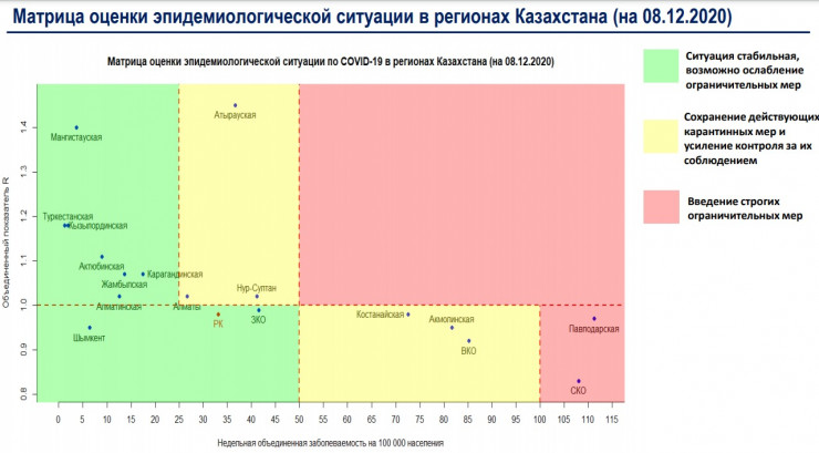 4 декабря Алматы на несколько дней возвращался в "зеленую" зону, а в "красной" находились Костанайская, Акмолинская, Павлодарская и Северо-Казахстанская области.