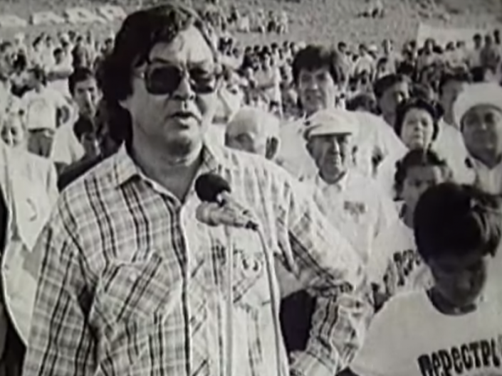 Қарауыл кентінде Олжас Сүлейменов ядролық қару-жарақтың сынағына қарсы жиналған адамдардың алдында сол кездегі Кеңес және АҚШ президенттеріне арналған үндеуді оқып берді.