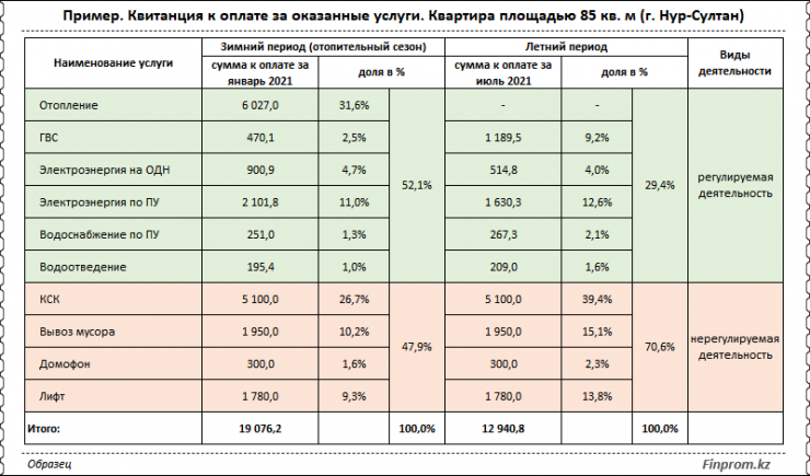 Авторы анализа разъяснили на примере средней квитанции в Нур-Султане, чем отличаются регулируемые и нерегулируемые услуги. К регулируемым относится холодное и горячее водоснабжение, водоотведение (канализация), электроэнергия, газоснабжение и теплоснабжение (отопление). В примере видно, что на них в зимний период пришлось 52,1 процента стоимости услуг, в летний — 29,5 процента. К нерегулируемым относятся услуги КСК, вывоз мусора, домофон.