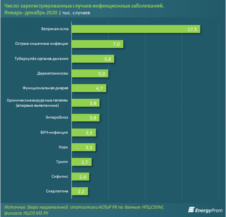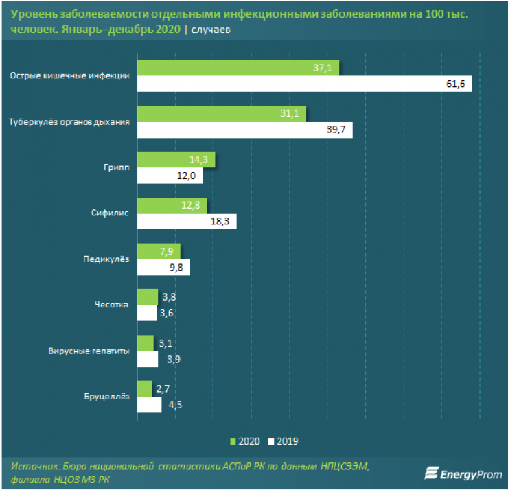 Что касается болезней, то в число наиболее распространенных инфекционных заболеваний в 2020 году вошли ветряная оспа, острые кишечные инфекции и туберкулез органов дыхания. Выросло число случаев гриппа, но при этом сократился уровень заболеваемости острыми кишечными инфекциями и туберкулезом.
