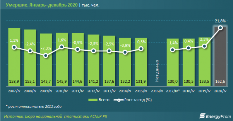 Аналитики озвучили статистику смертей за 2020 год. С января по декабрь 2020 года в стране умерли 162 тысячи человек, передает Tengrinews.kz со ссылкой на Energyprom.