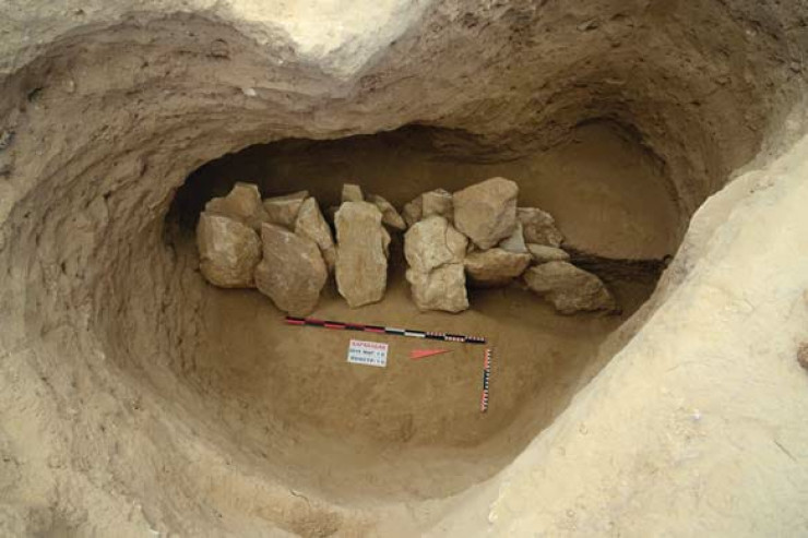 Куски известняка и кремня лежали на древней поверхности в один-два слоя. Основной массив камня был сосредоточен в южном секторе и представлял собой выброс, образовавшийся после "грабительских" раскопок.