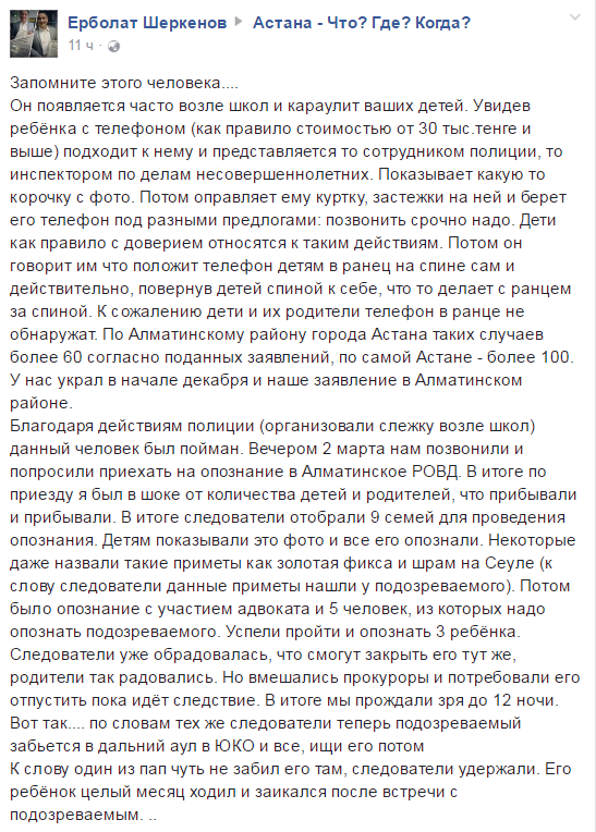 В группе "Астана - Что? Где? Когда?" в Facebook житель столицы пожаловался на неизвестного мужчину, якобы отбирающего сотовые телефоны у школьников. По словам Ерболата Шеркенова, мужчина дожидается детей возле школ и обманным путем отбирает у детей телефоны под предлогом срочного звонка. Пользователь отмечает, что случаев, связанных с мошенником по Астане, согласно поданным заявлениям родителей, более 60.