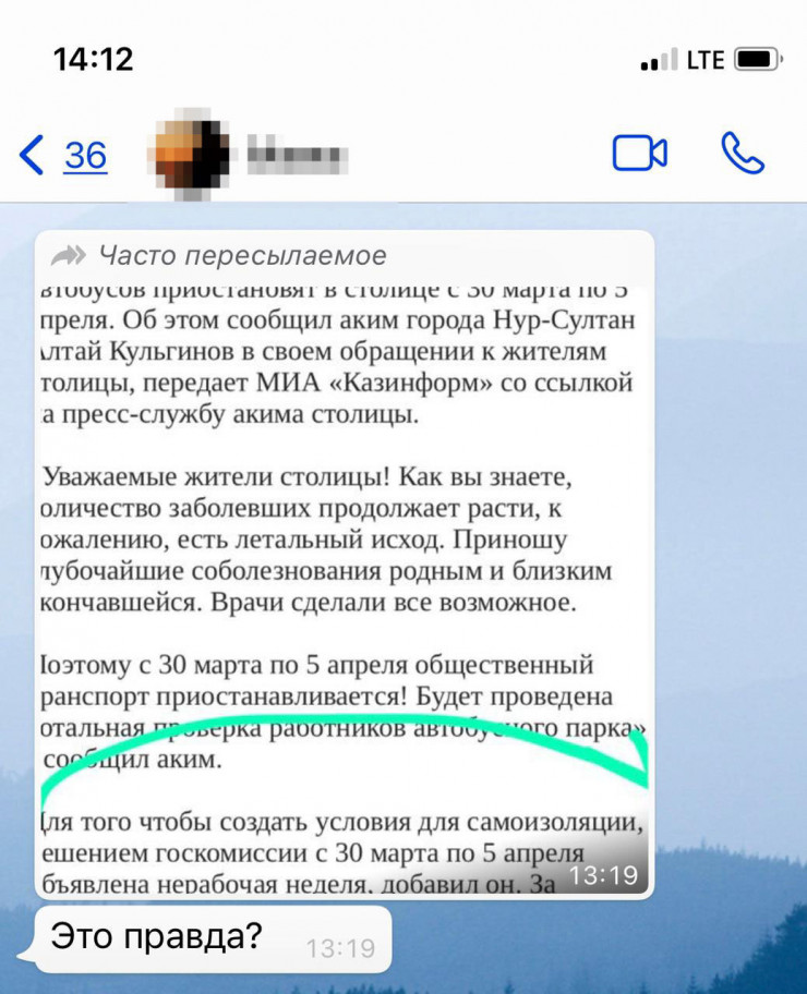 Горожане рассылают скриншот новости с обращением акима Алтая Кульгинова, в котором говорится, что в столице будет проведена проверка работников автопарка, а также с 30 по 5 апреля объявлена нерабочая неделя.