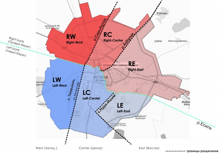 Принцип присвоения индексов улицам заключается в разделении города на шесть ориентировочных районов - это правый берег - запад, центр, восток, и, соответственно, левый берег - запад, центр, восток. Границы разделения соответствуют естественным границам, таким как реки Есиль, Сарыбулак, Акбулак, озеро Талдыколь и канал Нура-Ишим.