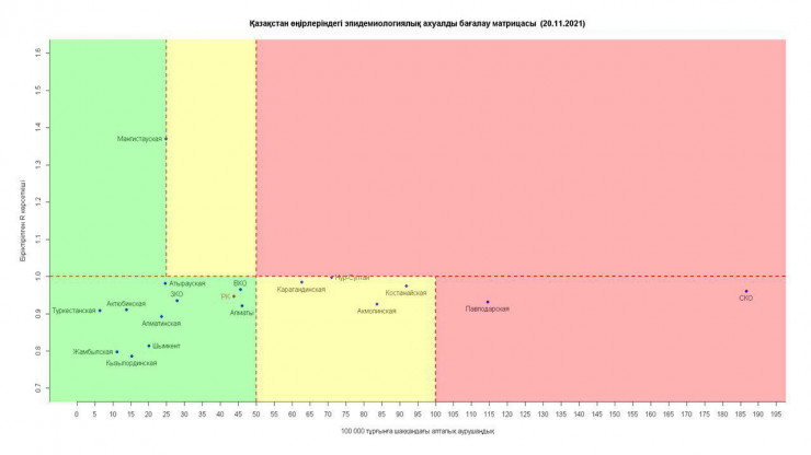 Атырауская область перешла из "желтой" в "зеленую" зону по коронавирусу, передает корреспондент Tengrinews.kz. Об этом свидетельствуют данные Матрицы оценки эпидемиологической ситуации в регионах Казахстана на 20 ноября 2021 года.