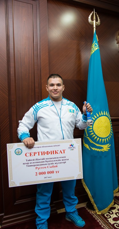 Тяжелоатлет Рустем Сыбай же занял второе место на 29-й Всемирной летней универсиаде, которая прошла в период с 19 по 30 августа в китайском Тайбэе. Аким области поздравил спортсменов  и призвал достичь побед на Азиатских играх в Южной Корее и на Олимпиаде в 2020 году в Токио.
