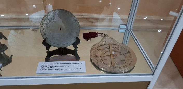 Сувенир "Астролябия" - подарок Нурсултану Назарбаеву от короля Иордании Абдаллы II. Сделана она из серебристого и золотистого металлов и украшена сверху изображением короны.