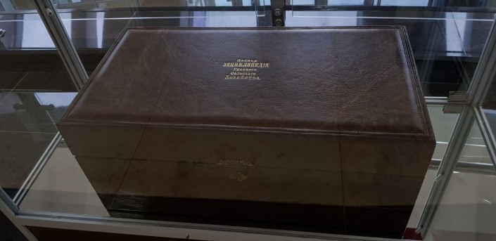 Фонд музея Темиртау пополнился и другими ценными экспонатами. Например, подарок Назарбаеву от Владимира Путина - антикварная 12-томная энциклопедия российского сельского хозяйства, выпущенная в Санкт-Петербурге в начале XX века. Названия книг оттиснены на кожаных корешках золотыми буквами. Обрез украшен рисунком под мрамор.