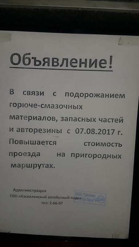 "Подорожали ГСМ, запчасти. Мы два года уже выживаем. Дальше у нас никаких продвижений. Мы 7 августа написали, чтобы пассажиры готовились. Мы планируем до 140 тенге повысить. Сейчас проезд по 100 тенге. Мы последние пять-шесть лет не поднимали стоимость проезда. От государства никогда не имели никакой помощи. Субсидирование никогда не давали областным маршрутам. Пригородные маршруты всю жизнь были убыточными. Предварительно посмотрим еще, на каких маршрутах будем повышать. Если мы дали объявление, это не значит, что подняли цену. Мы думали, сейчас поднимем, но пока решаем", -  сообщил исполнительный директор ТОО "Каскеленский автобусный парк" Асанбек Садыркулов.