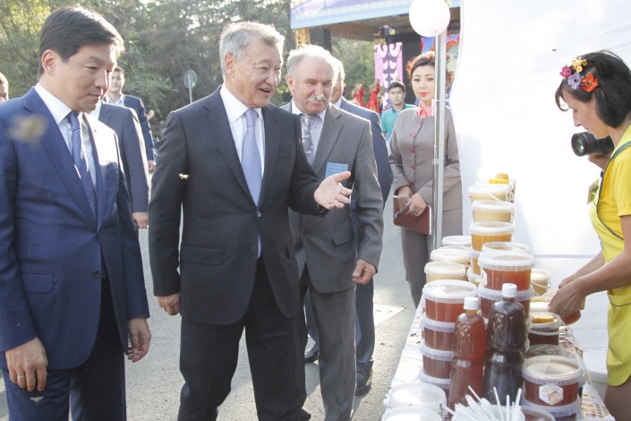 По ярмарке прошлись акимы Даниал Ахметов и Бауыржан Байбек, которые попробовали несколько сортов меда. Пчеловоды подарили главе города около пяти килограммов меда.
