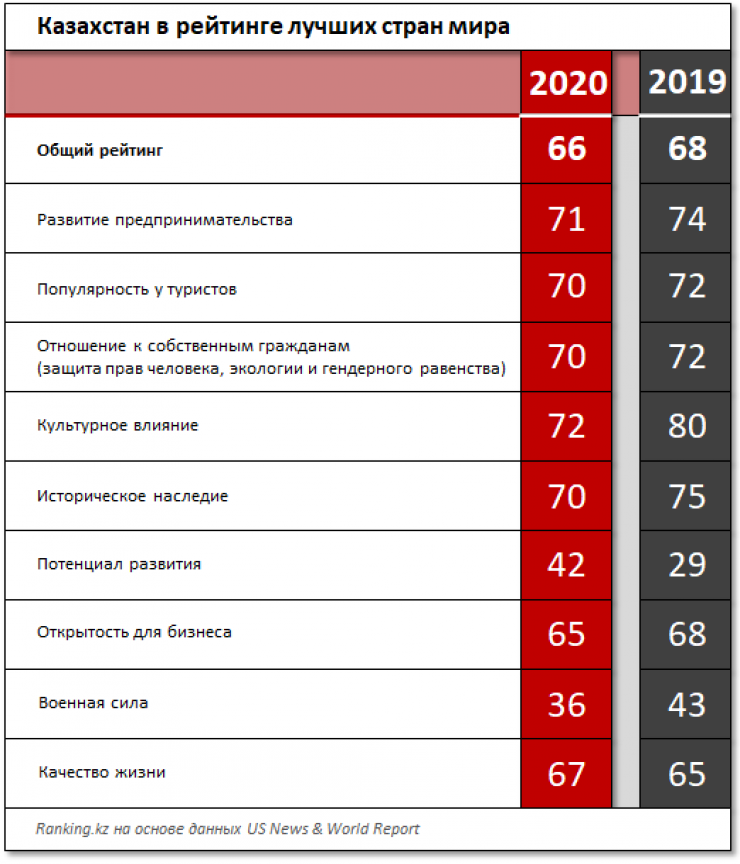 В рейтинге лучших стран мира Казахстан занял 66-е место, расположившись между Гватемалой и Ганой, передает Tengrinews.kz со ссылкой на Ranking.kz.