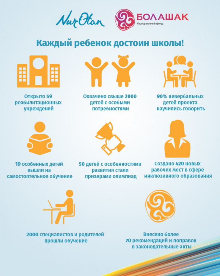 Создано 420 новых высококвалифицированных рабочих мест в сфере инклюзивного образования. 2 тысячи специалистов и родителей прошли специальное обучение. Для системного решения на уровне государства фондом внесено более 70 рекомендаций и поправок в законодательные акты".