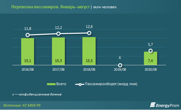 По данным аналитиков агентства, в сегменте пассажирских перевозок по итогам восьми месяцев по железной дороге перевезены 7,4 миллиона человек - на 49,6 процента меньше, чем годом ранее. В то же время непосредственно за август перевезли 828,9 тысячи пассажиров - на 16,9 процента больше, чем месяцем ранее. Пассажирооборот составил 5,7 миллиарда пассажирокилометров - на 53 процента меньше, чем годом ранее. В августе показатель составил 709,1 миллиона пассажирокилометров, увеличившись на 18,3 процента по сравнению с июлем.