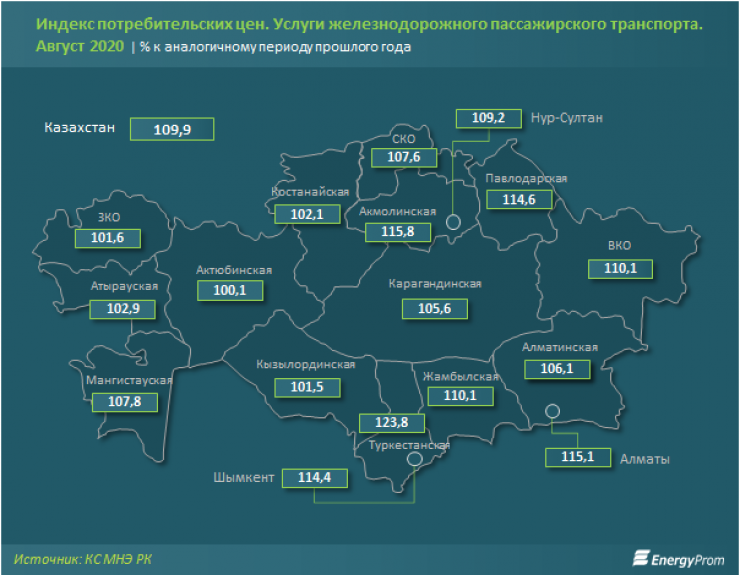 Услуги пассажирского железнодорожного транспорта в августе подорожали на 9,9 процента. Сильнее всего среди регионов ощутили рост цен жители Туркестанской области: годовое удорожание составило 23,8 процента. Также заметно выросли цены в Акмолинской области (на 15,8 процента) и в Алматы (на 15,1 процента).