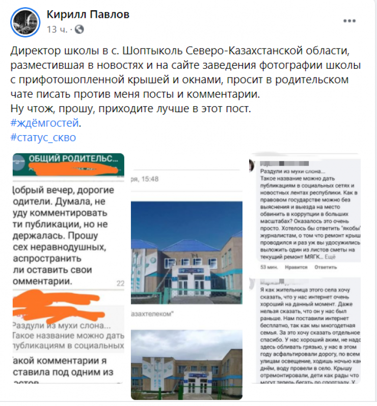 "Директор школы в селе Шоптыколь Северо-Казахстанской области, разместившая в новостях и на сайте заведения фотографии школы с крышей и окнами из Photoshop, просит в родительском чате писать против меня посты и комментарии", - написал он.