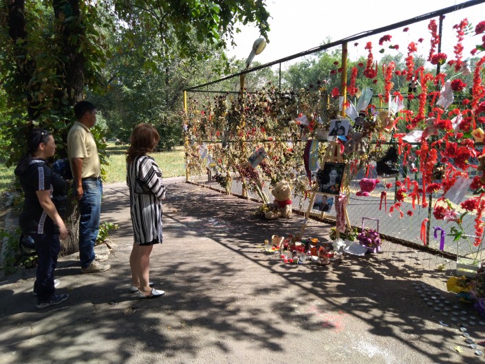 Металлическая сетка ограждения спортплощадки, возле которой напали на Дениса, сейчас сплошь увита цветами. Одни уже высохли, другие - совсем свежие, третьи простоят, пока их не уберут - алматинцы несут и искусственные.
