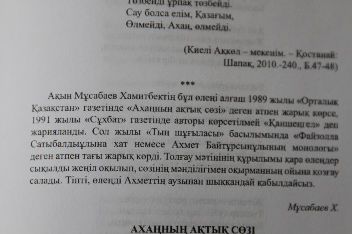 "Бұл өлеңді БАҚ бетінде алғаш жариялаған Хамитбек Мұсабаев, ол кісіге рақмет. Алайда, суретке түсіріп жариялағанда, оның хат екенін көргеннен кейін, аудиожазбада Ахмет Байтұрсынұлының дауысы деген қаңқу сөздер шықпас па еді. Ал Хамитбек Мұсабаев осы өлең-хат арналып жазылған Құран қари, ақын Файзолла Сатыбалдыұлының жиені", - деп түсіндірді Райхан Имаханбет.