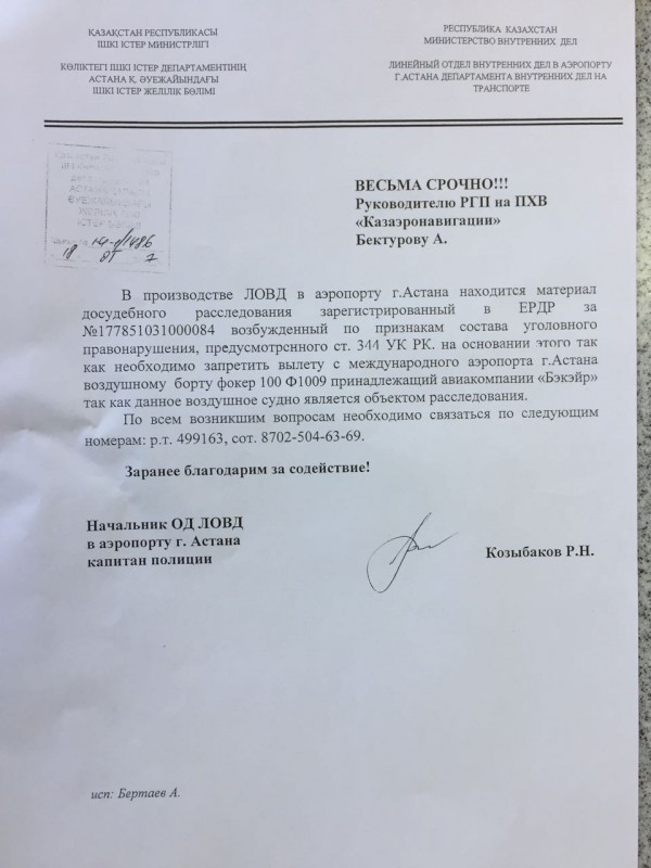 Cамолет "Бек Эйр" задержан полицией в аэропорту Астаны