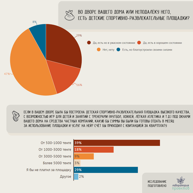 Однако 47 процентов участников опроса ответили, что в их дворе или неподалеку от него нет спортивно-развлекательных площадок, лишь у 29 процентов они имеются и в хорошем состоянии.