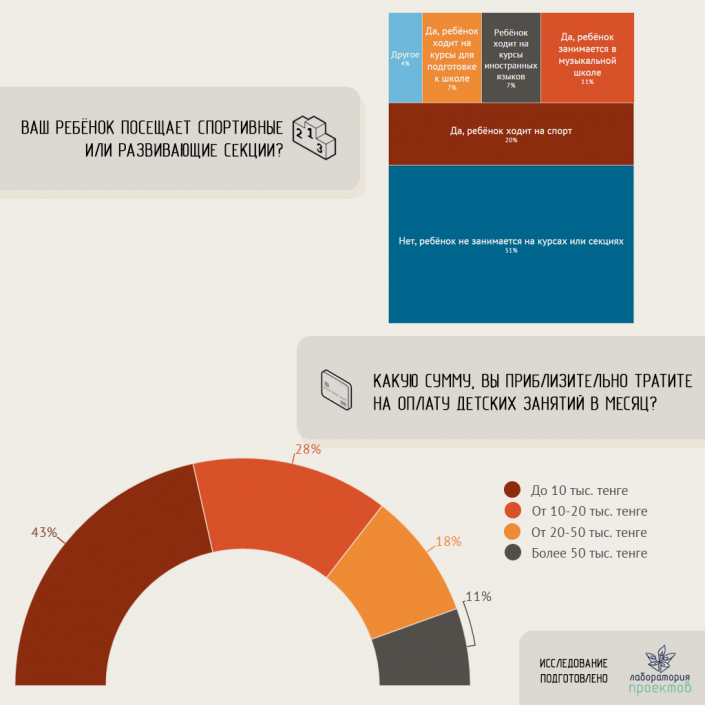 Кроме того, согласно исследованию, у 51 процента опрошенных дети не занимаются на курсах и в секциях, а лишь у 20 процентов респондентов они занимаются спортом. Отвечая на вопрос, какую сумму родители приблизительно тратят на оплату детских занятий в месяц, 43 процента опрошенных назвали сумму до 10 тысяч тенге. 28 процентов респондентов тратят на детские занятия от 10 до 20 тысяч тенге и 18 процентов респондентов - от 20 до 50 тысяч тенге.