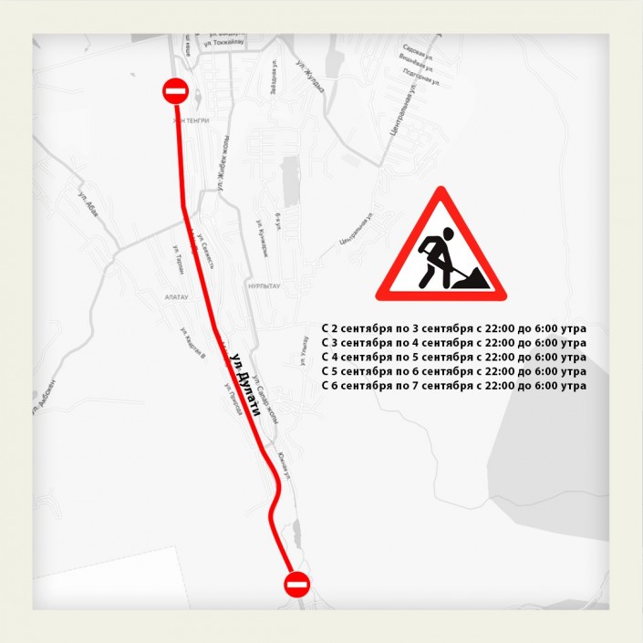 Также будет перекрыт проспект Дулати, ведущий к ущелью Алма-Арасан и Большому Алматинскому озеру. В связи с проведением дорожно-ремонтных работ участок от экологического поста до поста ГАИ будет перекрыт в ночное время с 2 по 7 сентября с 22.00 до 06.00 утра.