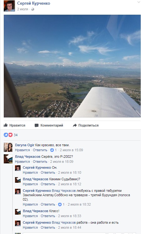 О том, что Сергей Курченко летал в Алматинской области свидетельствует комментарий, оставленный им же на странице в Facebook: "Любуюсь с правой табуретки Заилийским Алатау. Соббсно на траверзе - третий Бурундая (полоса 02)". Предположительно, фото сделано из самолета Tecnam 2002.