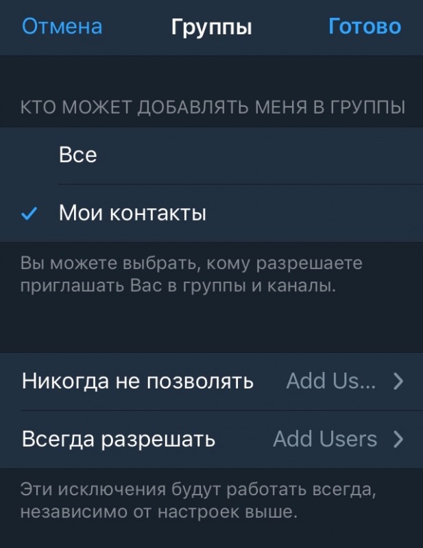 Отметим, что в мессенджере Telegram есть возможность ограничить функцию добавления в чаты или каналы. В настройках в графе "Конфиденциальность" есть раздел "Группы". В нем пользователя спросят, кто может добавлять его в группы мессенджера. Пользователь может запретить людям, чьи номера не сохранены на телефоне, добавлять его в чаты.