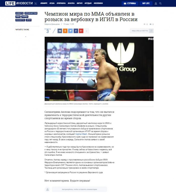 Несколько дней назад российские СМИ выдали новость о том, что казахстанский спортсмен якобы объявлен в розыск за привлечение спортсменов из России в террористическую организацию ДАИШ (запрещена в Казахстане) во время сборов и мировых чемпионатов. Инициаторами розыска якобы стали спецслужбы Красноярского края, куда он приезжал на соревнования пару лет назад. В частности, об этом написал портал L!FE со ссылкой на группу "ВКонтакте" Mash.