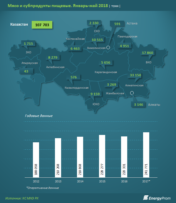 Традиционно наибольшие объемы обеспечили мясоделы Алматинской области - уже 30,8 процента от РК (это 33,2 тысячи тонн - сразу на 31,2 процента больше, чем годом ранее). Также в тройке ключевых регионов - производителей мяса - ВКО (16,6 процента от РК) и Акмолинская область (9,8 процента от РК).