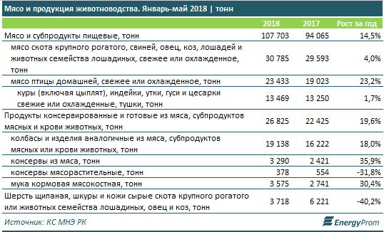 Примечательно, что выпуск мяса птицы подскочил сразу на 23,2 процента год-к-году, до 23,4 тысячи тонн по итогам января-мая, в то время как производство мяса КРС, свинины и конины увеличилось лишь на 4 процента, до 30,8 тысячи тонн.
