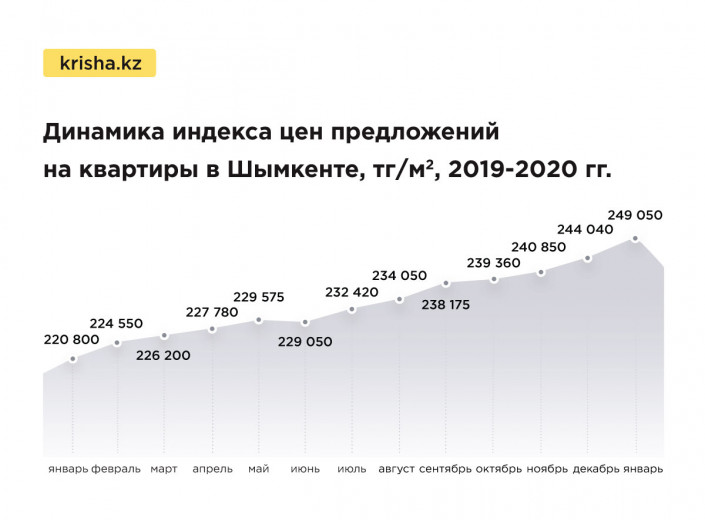 В Караганде продавцы жилья рассчитывали получить за "квадрат" в среднем 231 150 тенге, на 2,2 процента больше, чем месяцем ранее. Прирост цен наблюдается также в Шымкенте (+2,1 процента). Стоимость "квадрата" достигла отметки 249 050 тенге за квадратный метр.