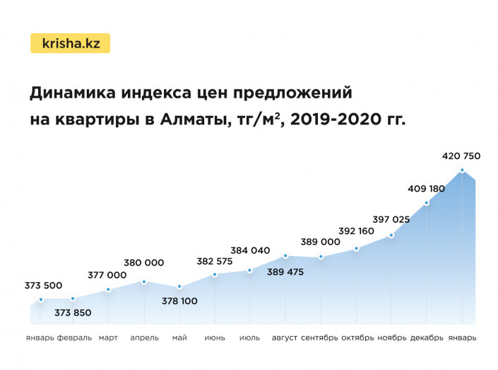 В число городов с наибольшей динамикой цен вошел и Алматы. Индекс прибавил 2,8 процента и достиг очередного максимума - 420 750 тенге за квадратный метр. Темп роста в последние месяцы ускорился.