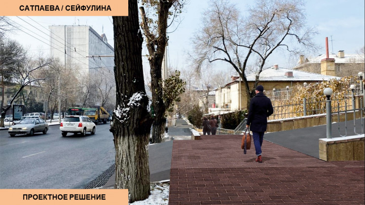 По данным акимата, общая длина проектируемого участка по улице Сатпаева 3,9 километра. Основной проблемой улицы является ее чрезмерная ширина (от Достык до Назарбаева). Когда-то она использовалась для проведения парадов военной техники. В управлении отметили, что сейчас такой необходимости нет, но есть необходимость создания комфортных городских пространств, расширения тротуара, озеленения.