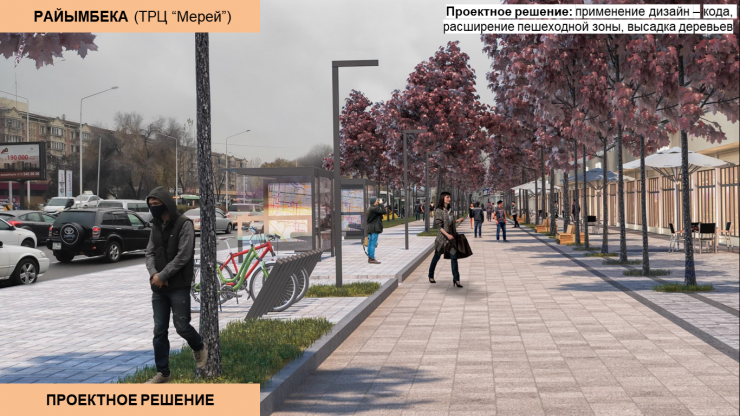 Планируется реконструировать участок от улицы Пушкина до проспекта Сейфуллина. Акимат ставит своей задачей улучшить и благоустроить северную сторону проспекта Райымбека ввиду большего количества торговых объектов и крупных остановочных комплексов, а также недостатка зеленых насаждений и тени в летнее время.