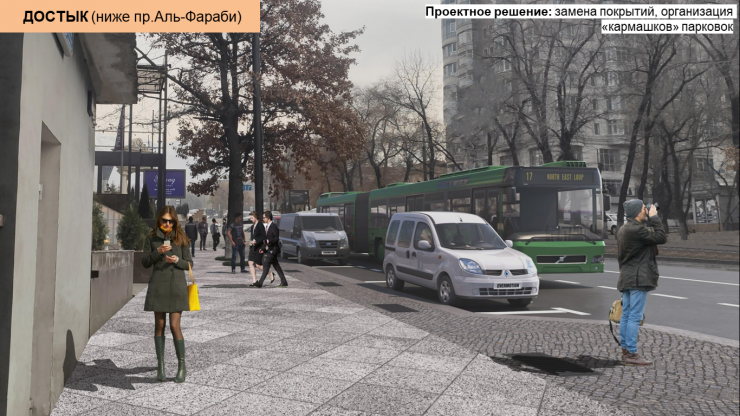 "Проект предусматривает более удобную связь с медиальными улицами, пересекающими проспект, где пешеходное движение через проспект осуществляется через подземные переходы на каждом перекрестке. Новая концепция рассмотрит возможность организации уличных переходов с переосмыслением внеуличных пешеходных переходов. Также будут учтены рекомендации дизайн-кода города к фасадам и тротуарной части", - отметили в акимате.